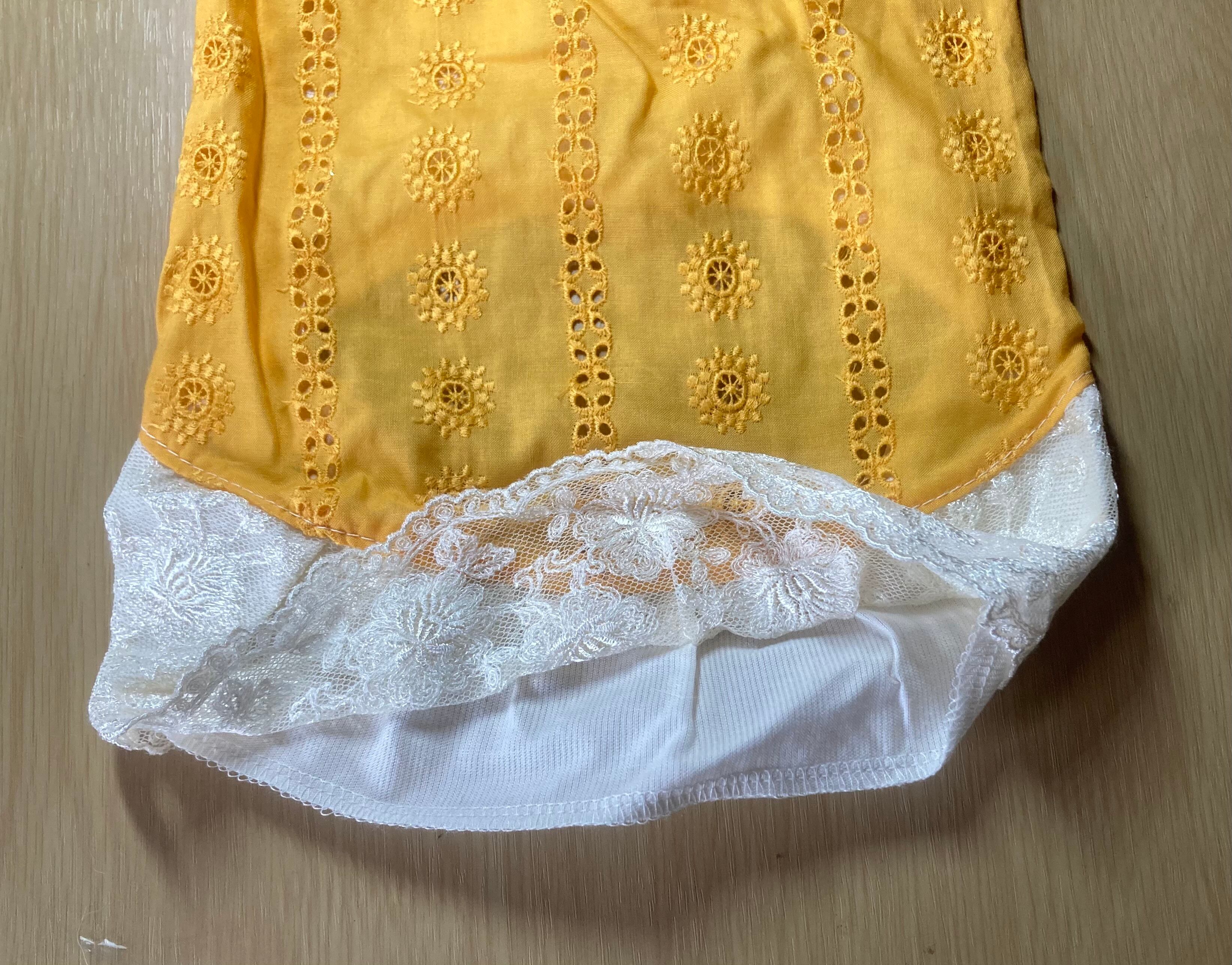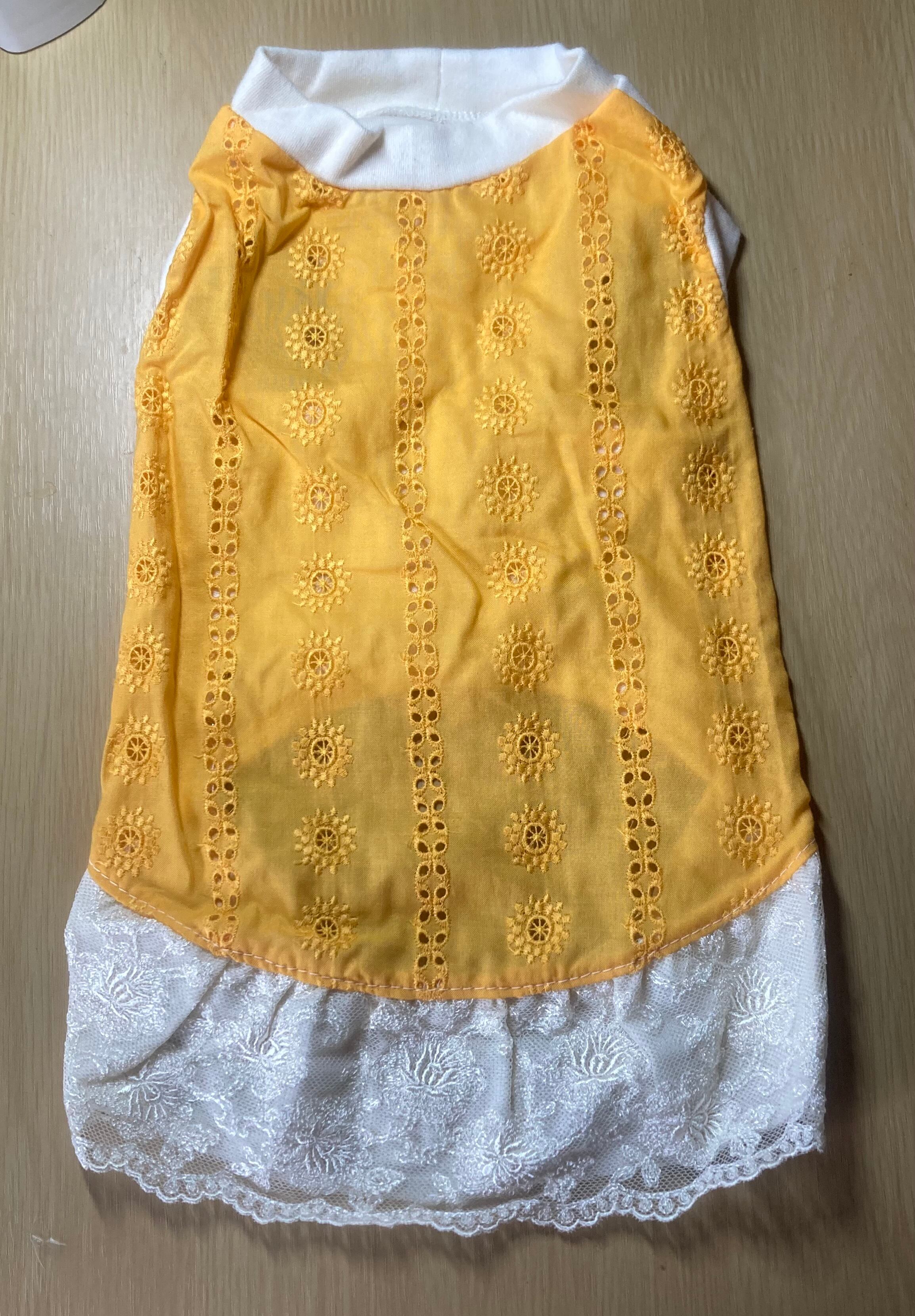 鮮やかなイエローに愛らしいお花の刺繍を散りばめた、透け感のあるシアー素材の犬服です。裾には、お花の刺繍が入った繊細なチュールレースをあしらい、お嬢様のような可憐さを演出しました。
